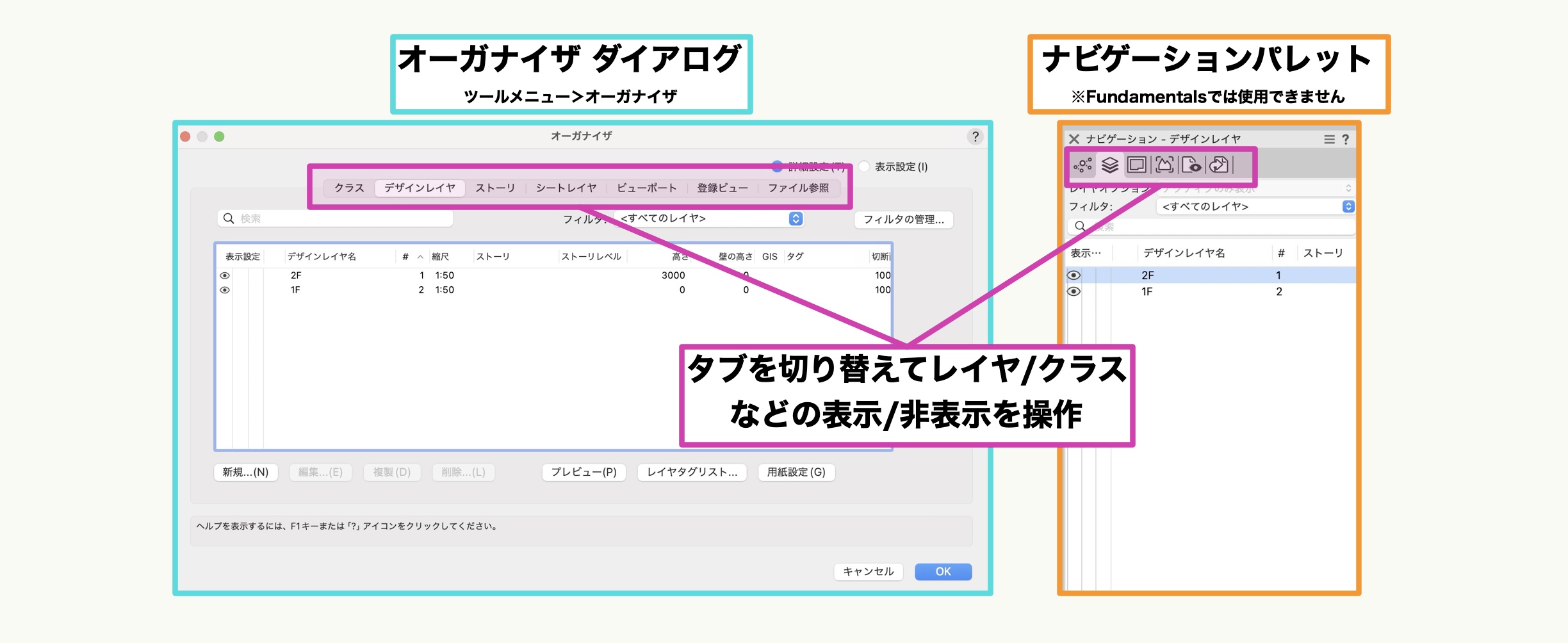Vectorworks Architect をはじめとする上位製品では、『ナビゲーション』パレットを使用できます。