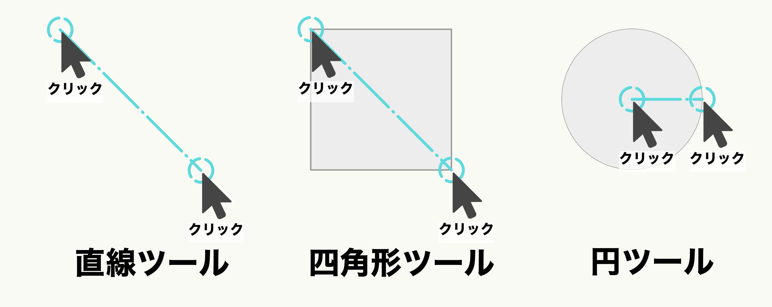 『四角形』ツールは、四角形の対角線をイメージして始点と終点でクリックすると作図することができ、『円』ツールは1回目のクリックで円の中心点となる位置を決定し、2回目のクリックで中心からの半径を決定することで作図を行います。