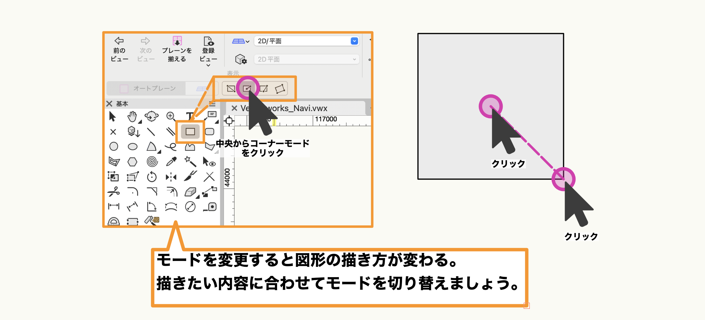 四角形を例にすると、通常の対角線で作図するモードや四角形の中心から角の範囲で作図するモード、斜めに角度をつけて作図するモードなどに切り替えることができます。