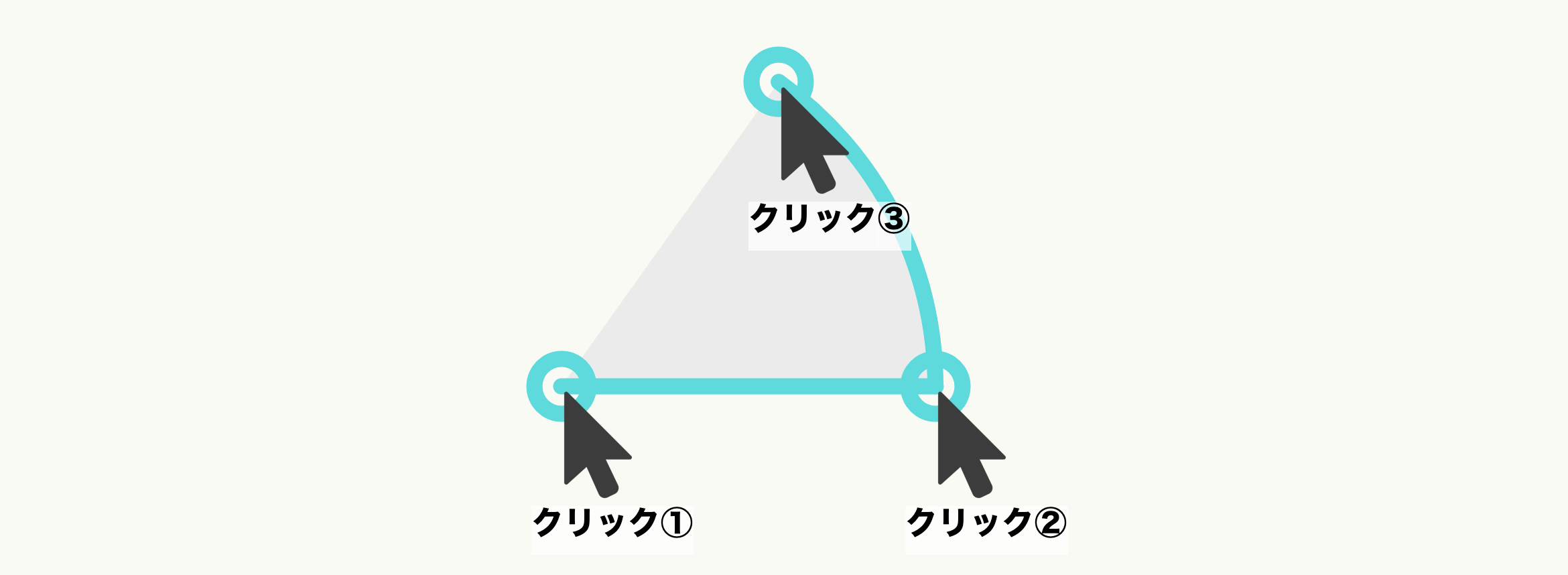 まず一つ目は『円弧』ツールです。円弧ツールは以下のように3ステップで作図するツールです。