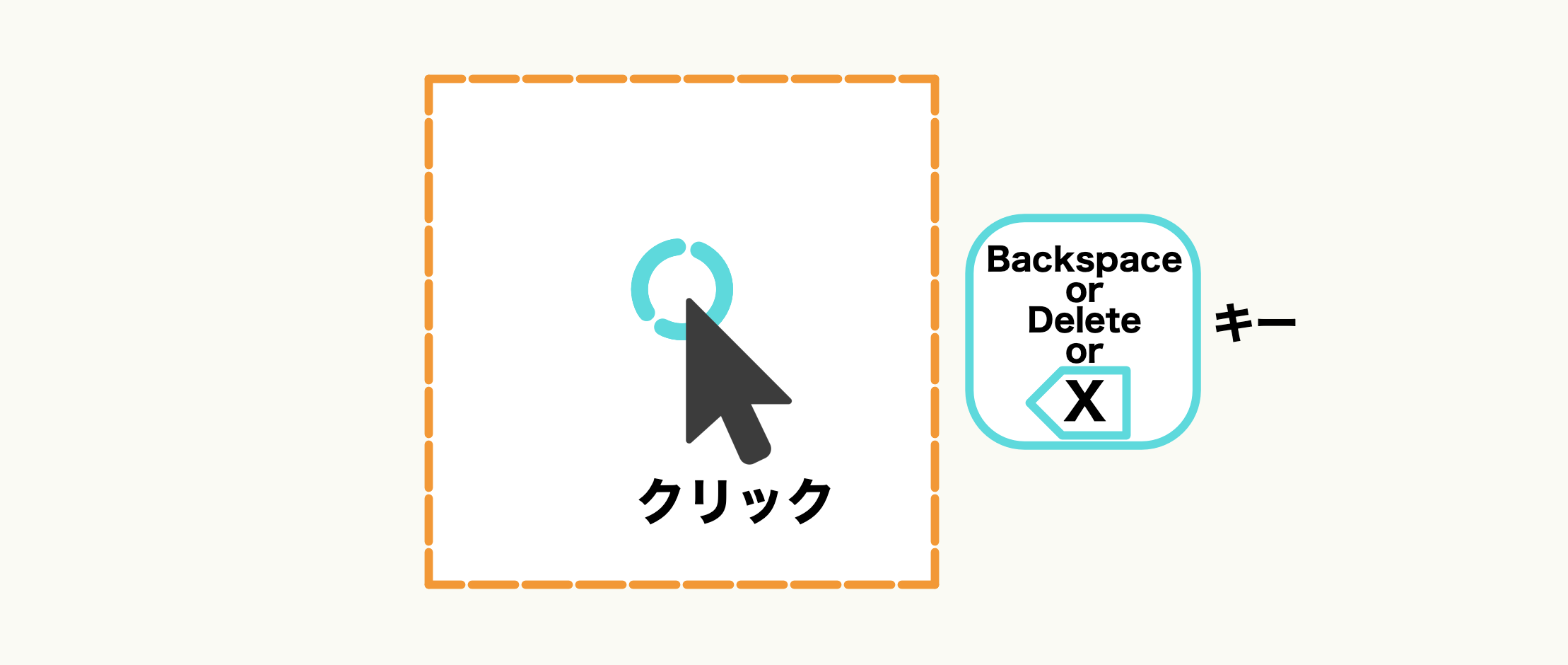図形選択状態でキーボードのbackspaceキーやdeleteキーを押すと、対象図形を削除できます。