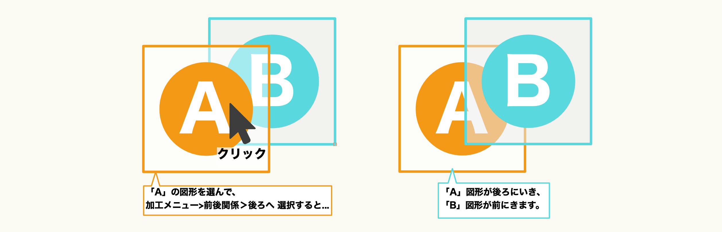 - 重なった部分を残す: 選択された2つの図形の重なっている箇所のみを残す形で加工するコマンドです。