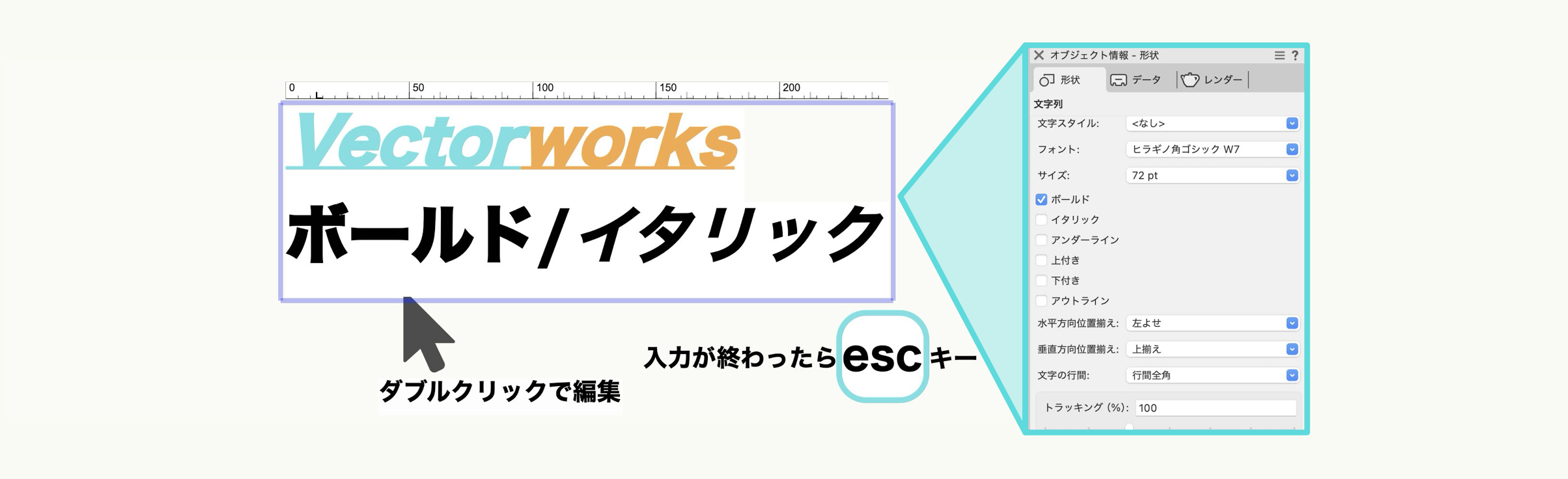 Vectorworksの基本的な操作の一つは、「作図ツールで図形を作成する」→「移動や修正がある場合、セレクションツールで選択」→「内容の確認や修正はオブジェクト情報パレットから行う」という流れとなります。