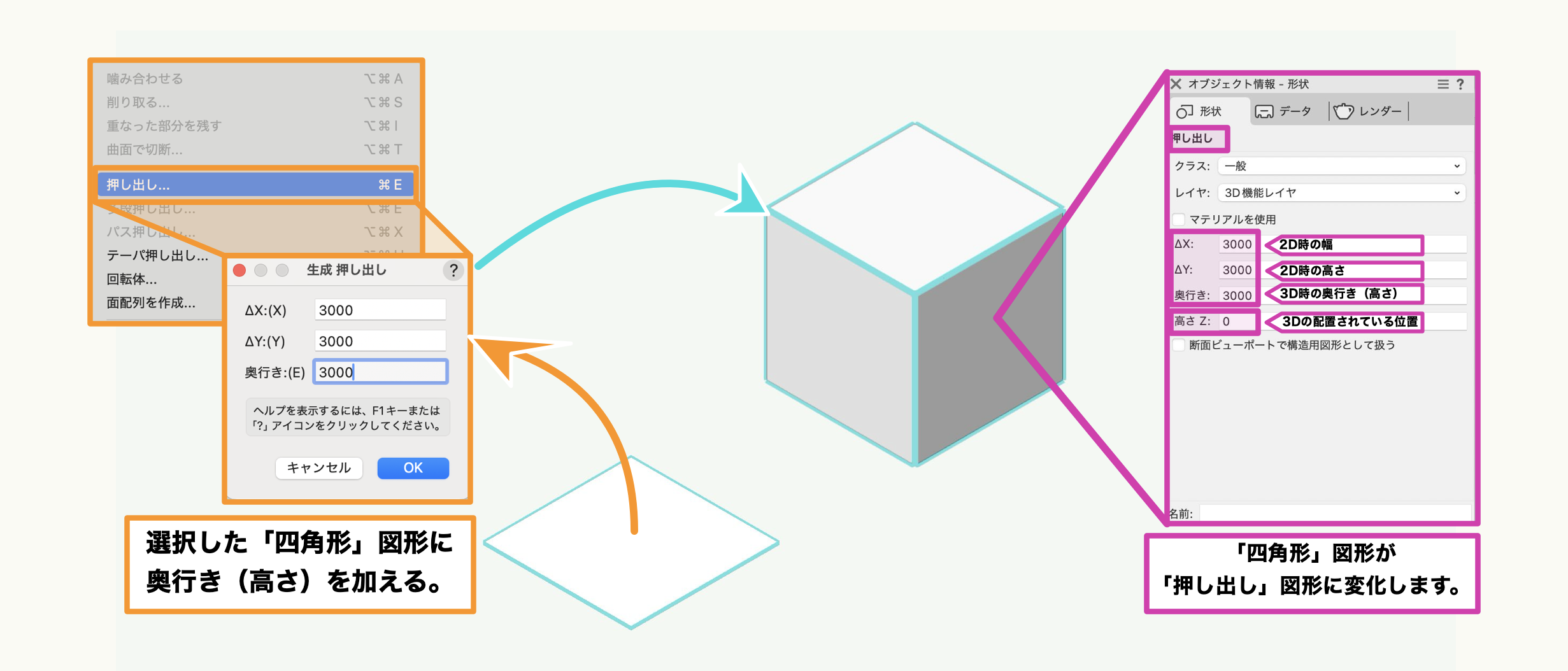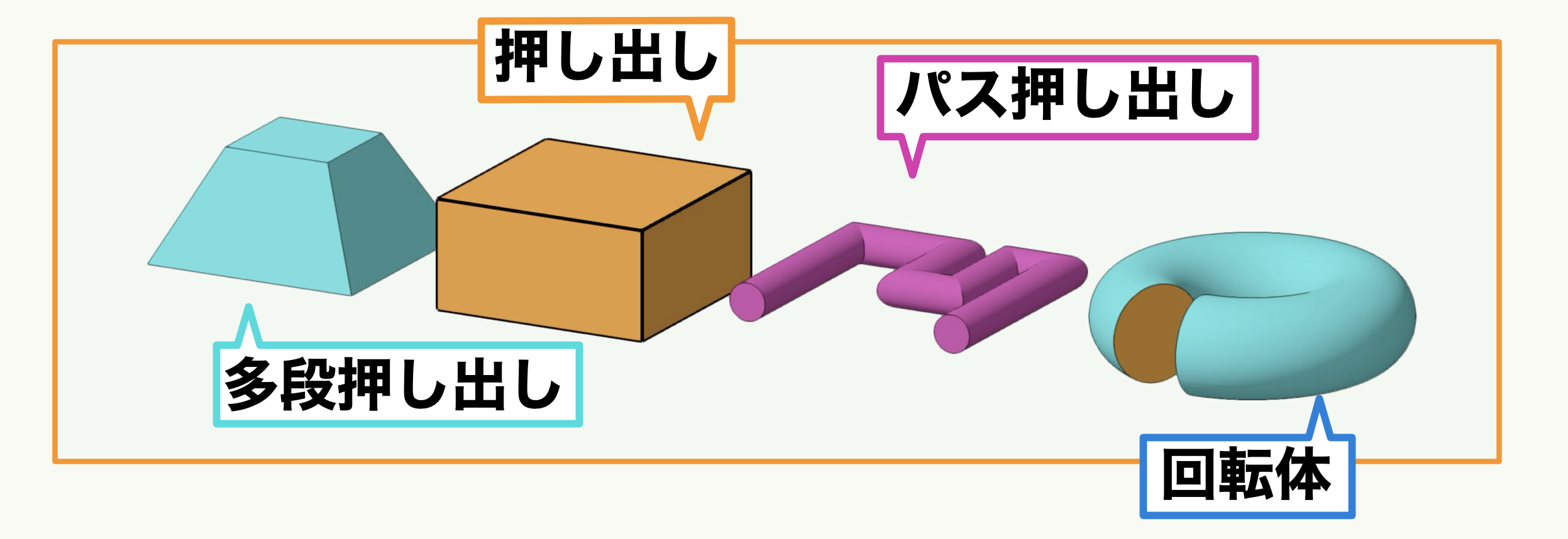 - 押し出し: 2D図形に高さ(奥行き)を持たせるコマンドです。