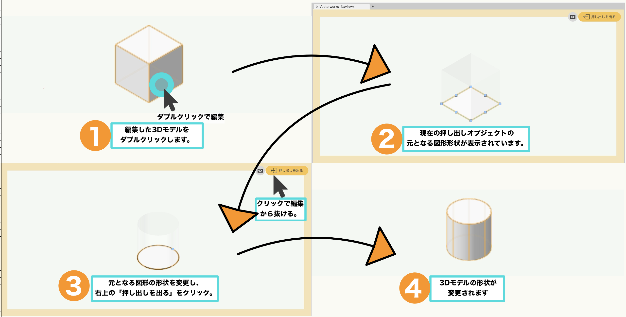 『押し出し』コマンドなどを使って作成した3Dモデルの場合、3Dモデルを直接ダブルクリックすることで、元となる2D図形を編集することができます。