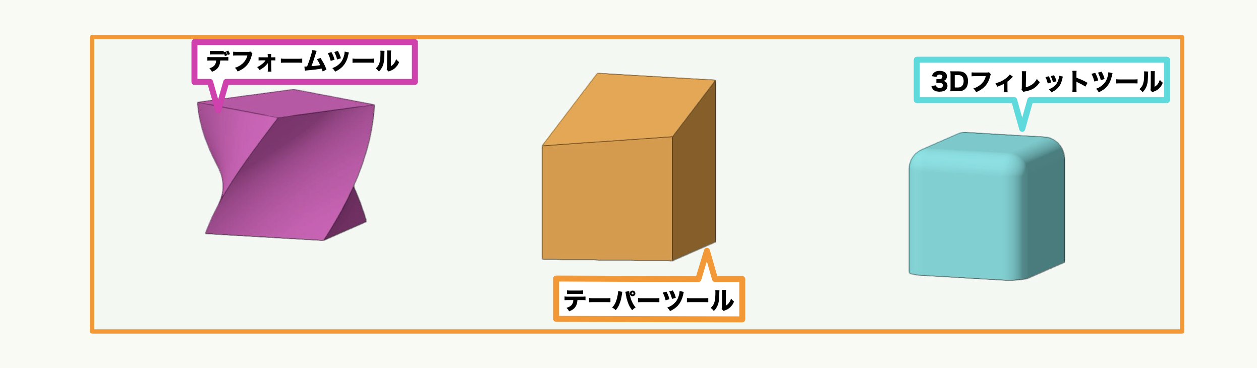 『3D』ツールセットの中身を少し紹介すると、例えばモデルの縁を丸くするフィレット処理を行える『3Dフィレット』ツールや、一部の面に傾斜をつけられる『テーパー』ツール、捻るような加工が可能な『デフォーム』ツールなどがあります。