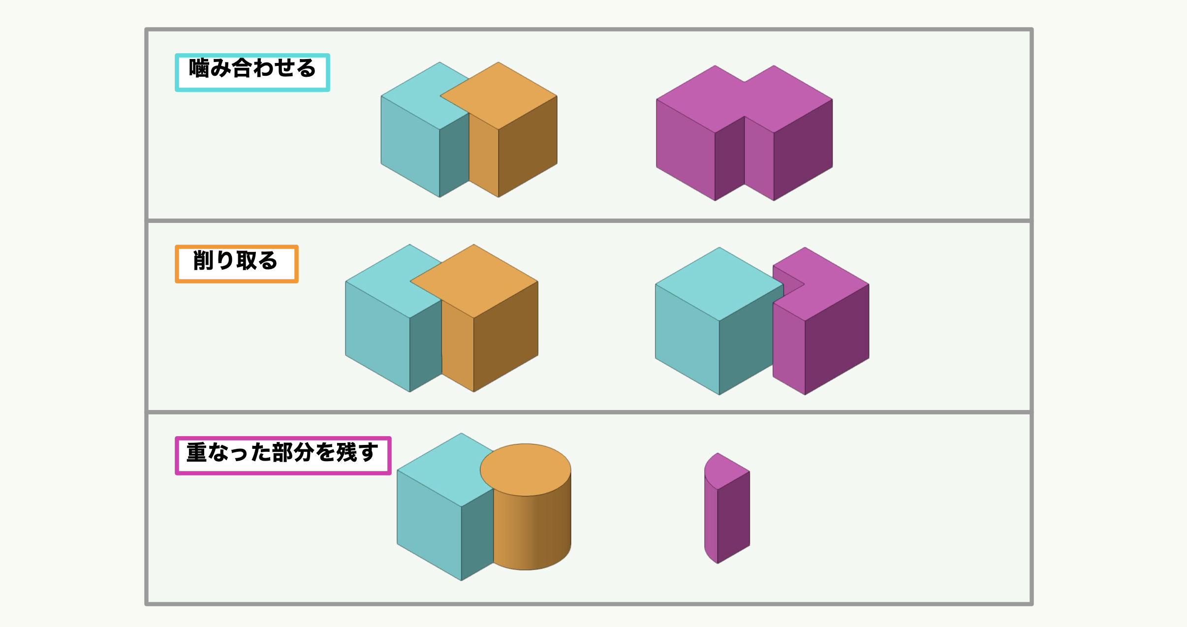 - 噛み合わせる: 2D図形の貼り合わせのような動作で、2つの選択された3Dモデルを合成する足し算のイメージのコマンドです。