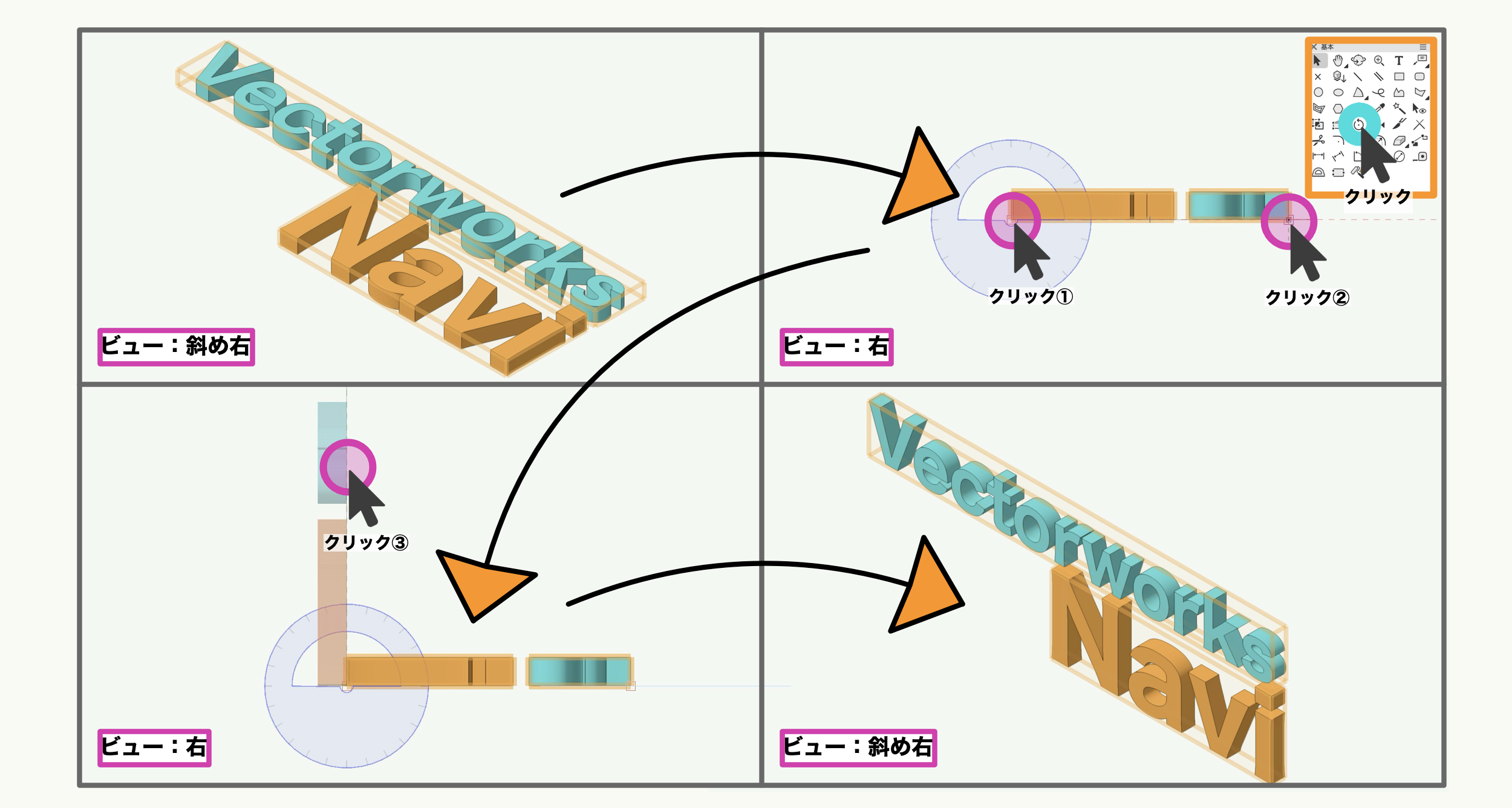 Vectorworks では、見る方向を「ビュー」という概念で管理しており、見たい方向に切り替えた状態で操作、作図、図面化をしていきます。