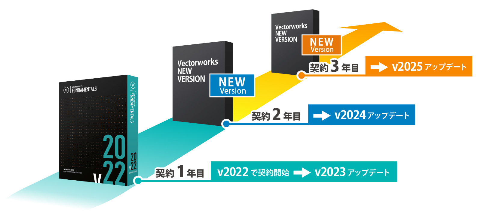 例えば、「Vectorworks Fundamentals 2022」1ライセンスを所有し、Service Select 契約を行った場合で、契約期間中に「新バージョン」がリリースされると、同時、もしくはリリース直後に、新バージョンの「Vectorworks Fundamentals」1ライセンスをご提供※します。ご契約者様自身でのお手続きは一切必要ありません。