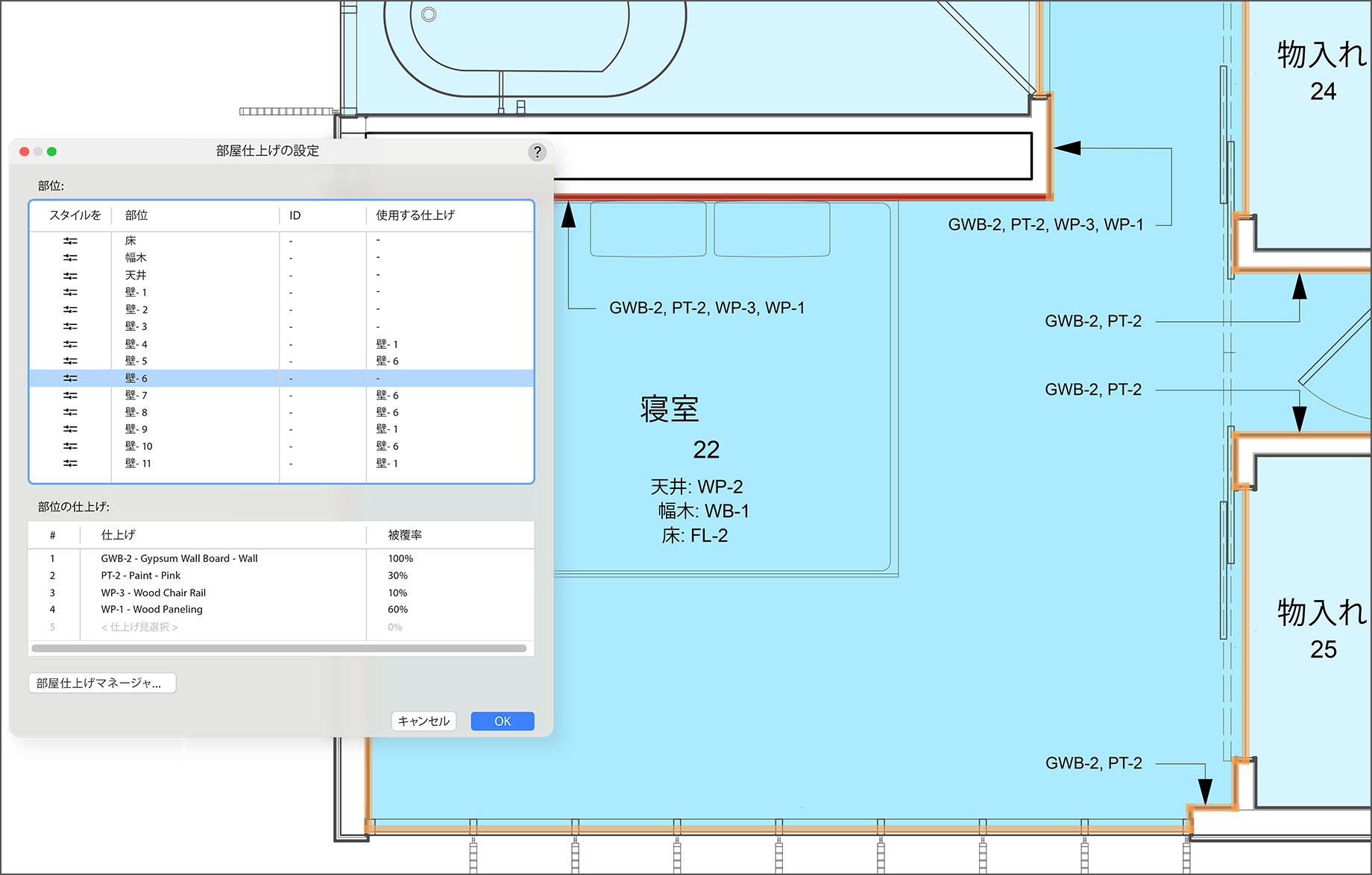 バージョン2025では、各方向の壁や床、天井に仕上げの表面処理を定義でき、図面の管理がより容易になりました。スペースの各種情報はデータタグで表示できるため、表現や情報のカスタマイズが柔軟に行えます。