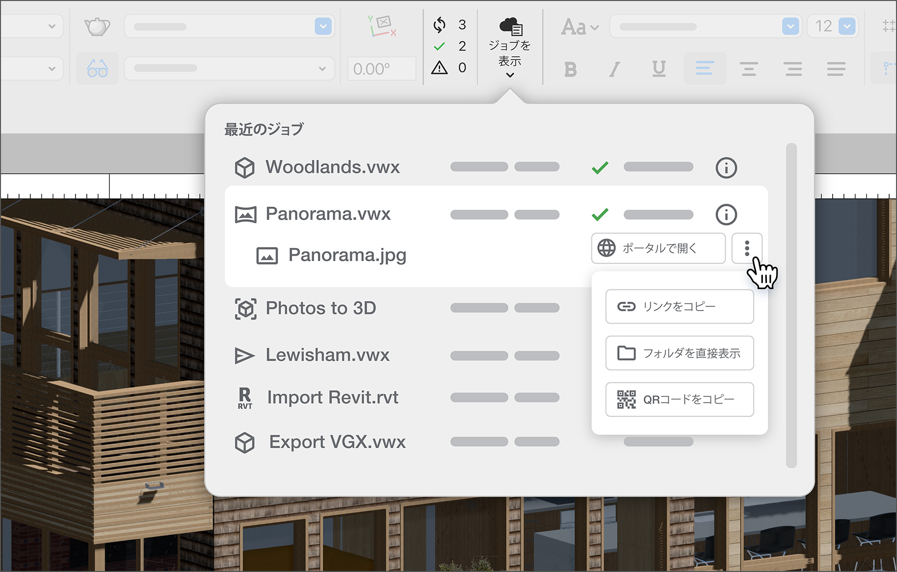 Vectorworks Cloud ServicesがVectorworksアプリケーションにスムーズに組み込まれていることで、デスクトップとクラウドの良さを兼ね備えた、効率的な利用環境が実現します。Vectorworksの表示バーにあるクラウドステータスウィジェットでは、リアルタイムのクラウド処理状況、ジョブの進行状況、および結果への直接アクセスを提供します。使用中のアプリケーションから離れることなく、クラウドの利便を享受できます。
