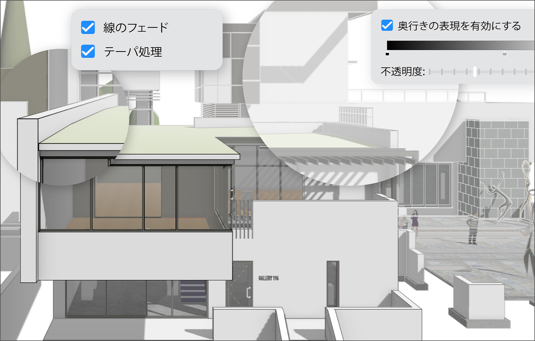 自動的に調整される奥行きの表現により、隠線消去およびシェイド表示のビューポートにおいて、オブジェクトの距離に応じて線の太さ、濃淡、ピクセルの透明度を調整できるようになります。手作業による調整が不要となり、奥行きや強調が伝わる、より鮮明で読みやすい図面を作成できるため、オフィスや業界の図面基準を満たす作業時間を短縮し、あらゆるプレゼンテーションの質を高めます。