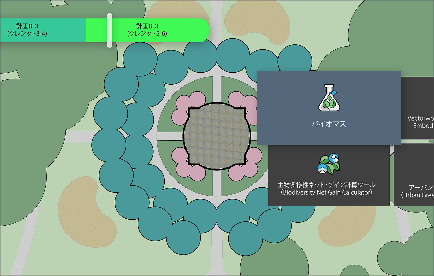 Vectorworksのサステナビリティダッシュボードは、設計作業中にエンボディドカーボン、都市緑化係数(UGF)、バイオマス、生物多様性ネットゲイン(BNG)をリアルタイムで追跡できます。プロジェクトが最初のコンセプト段階からサステナビリティ基準を満たすことで、コストのかかる後工程での修正を防ぎ、要件に適合した迅速な設計を可能にし、環境配慮のリーダーとしての評価を高めることができます。