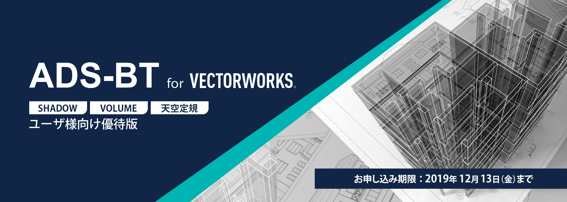 Vectorworks上で作成した建物モデルをもとに、斜線・逆日影でのボリュームスタディや日影計算、天空率計算が可能となるVectorworks専用のプラグインソフトウエア「ADS−BT for Vectorworks」を、A&A SHADOW、A&A VOLUME、A&A 天空定規をお持ちのユーザ様向けに優待価格でご提供します。優待価格でのご提供は本案内で最終となります。ぜひ、この機会にお申込みください。