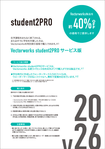 Vectorworks student2PRO は、学生単年度版をご利用になられたみなさんがVectorworks製品を特別価格でご購入いただけるサービスです。