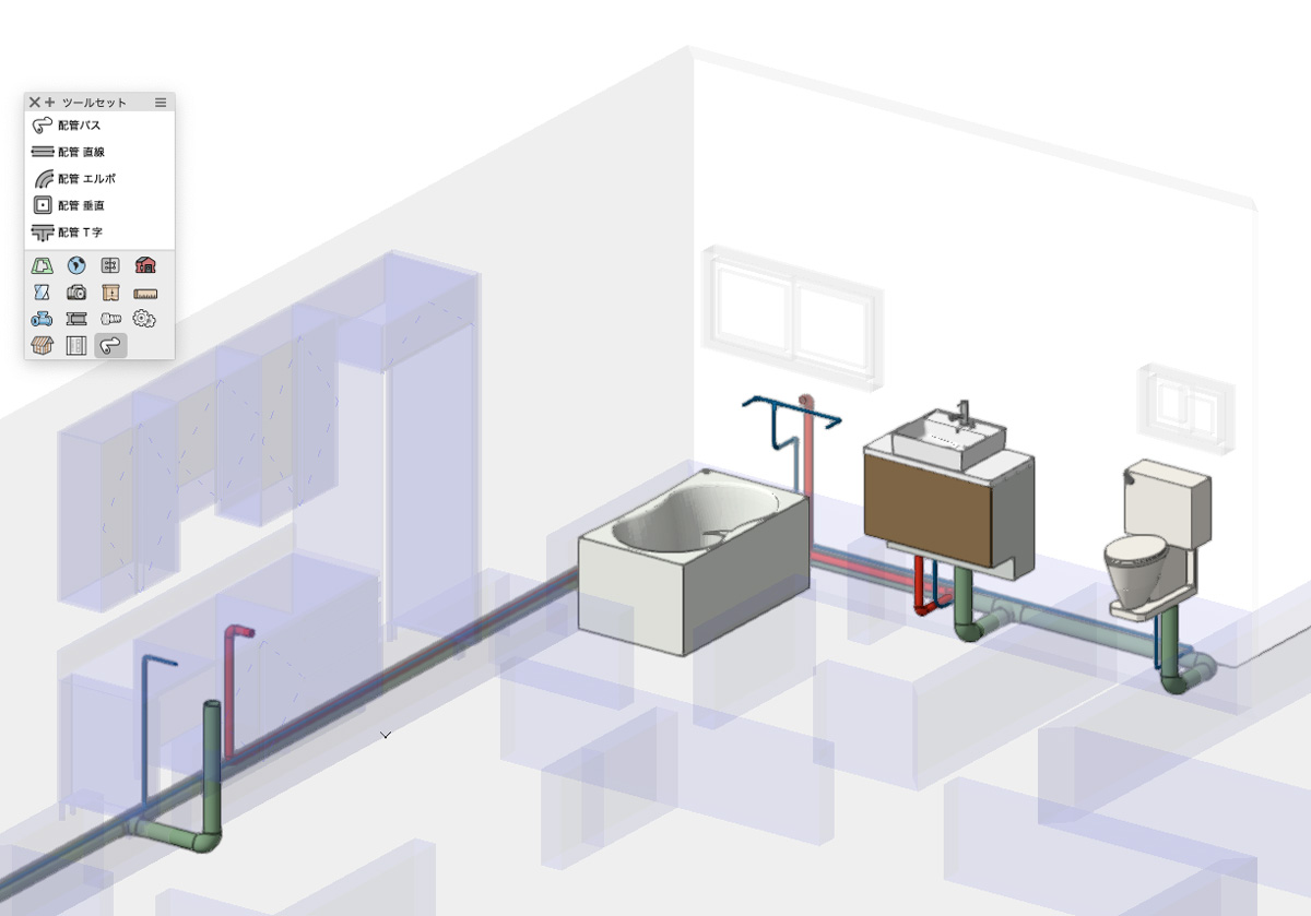 多角形ツールと同じ要領でパスの頂点をクリックしていくだけで3Dの配管部材が配置されるので、配管システムを簡単かつ迅速に作成し、意匠や躯体との干渉具合をすぐに確認できます。