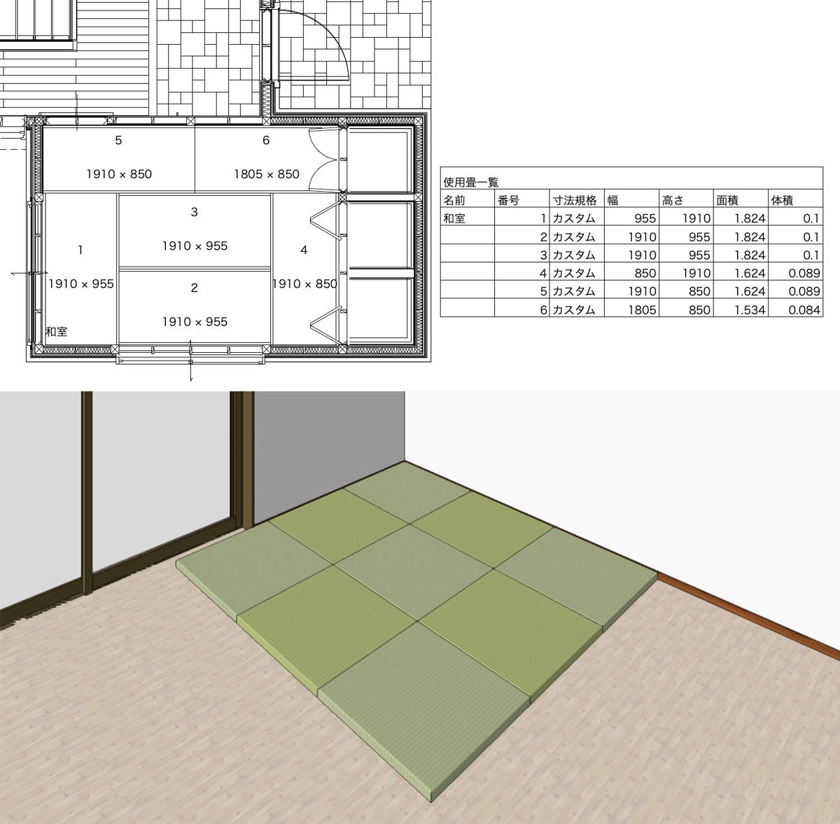畳ツールは、日本家屋で利用される畳(関東間や京間)、琉球畳をマウスクリックで配置する2D/3Dで表示可能なパラメトリックオブジェクトツールです。2D/3Dの表示はクラス設定することで図面とパースの表現を変えることもできます。1間の大きさをカスタム指定し、様々なプランに対応できます。