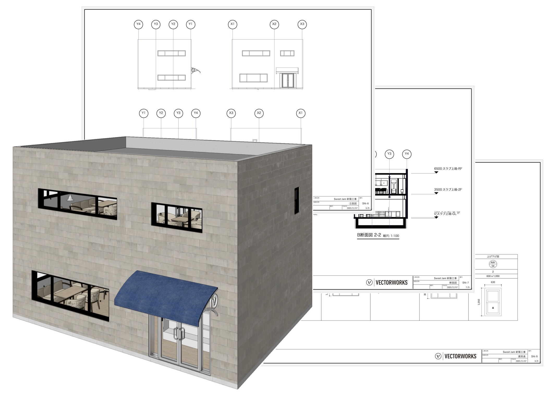 Vectorworks Architect 操作体験 ハンズオン鉄骨造のカフェを題材に、BIMモデル作成から図面取り出し、面積表や建具表作成、モデル編集と図面への反映、設計図書のPDF化までの流れを体験いただきます。Vectorworks Architectの基本操作を把握いただける講座です。難易度 Vectorworks Architectの操作を体験したい方、Fundamentalsとの違いを知りたい方に!