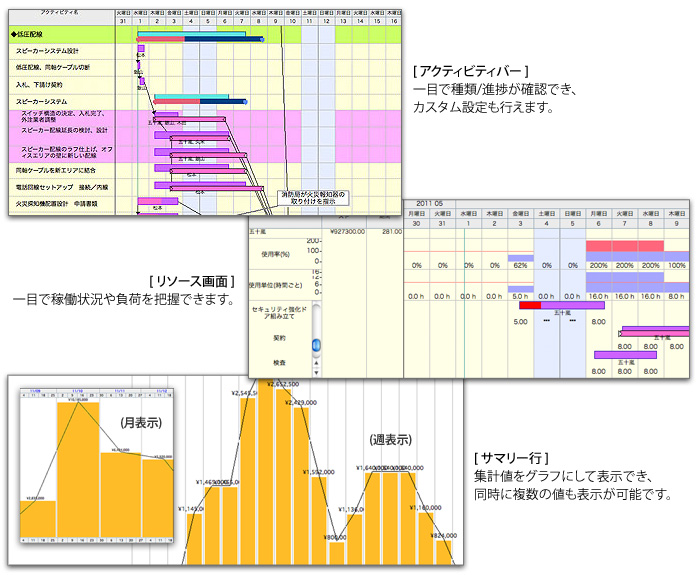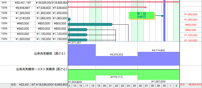 正確な見積もりやコスト実績値・出来高実績値の把握、遅延や将来のコストと期間の予測など一目で把握することができます。