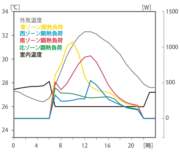 建物屋内環境は、屋外からの外的要因に大きく左右されます。特に日射の影響は大きく、この要素をコントロールすることで建物熱負荷量や空調機のエネルギー消費を抑制することが可能です。また屋外の熱、特に外壁面の熱を室内側へ伝えないことも重要です。