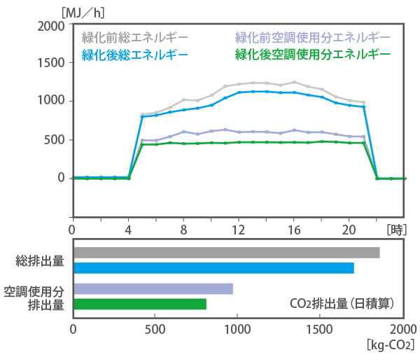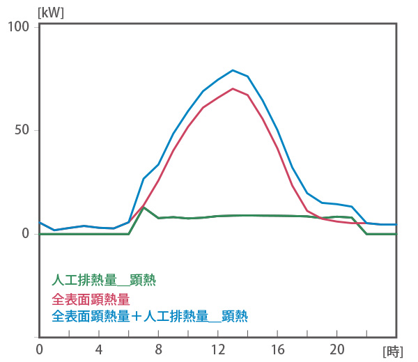 また、屋外環境の影響を考慮に入れた計算が可能なため、例えば、建物の熱負荷に配慮した周辺の緑化や、屋上・壁面緑化の効果を検討することもできます。