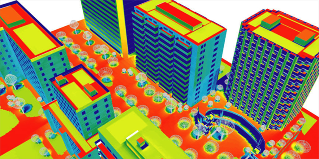 3Dビジュアルでは屋外表面温度を表現でき、あらゆるアングルから対象物・敷地を見ることが可能です。温度レンジもダイアログ調整が可能なため、季節、時間に合わせて表示切り替えを行うことが可能です。この熱収支計算を元に、さらに詳細な熱環境指標や建物エネルギー計算を行うことができます。