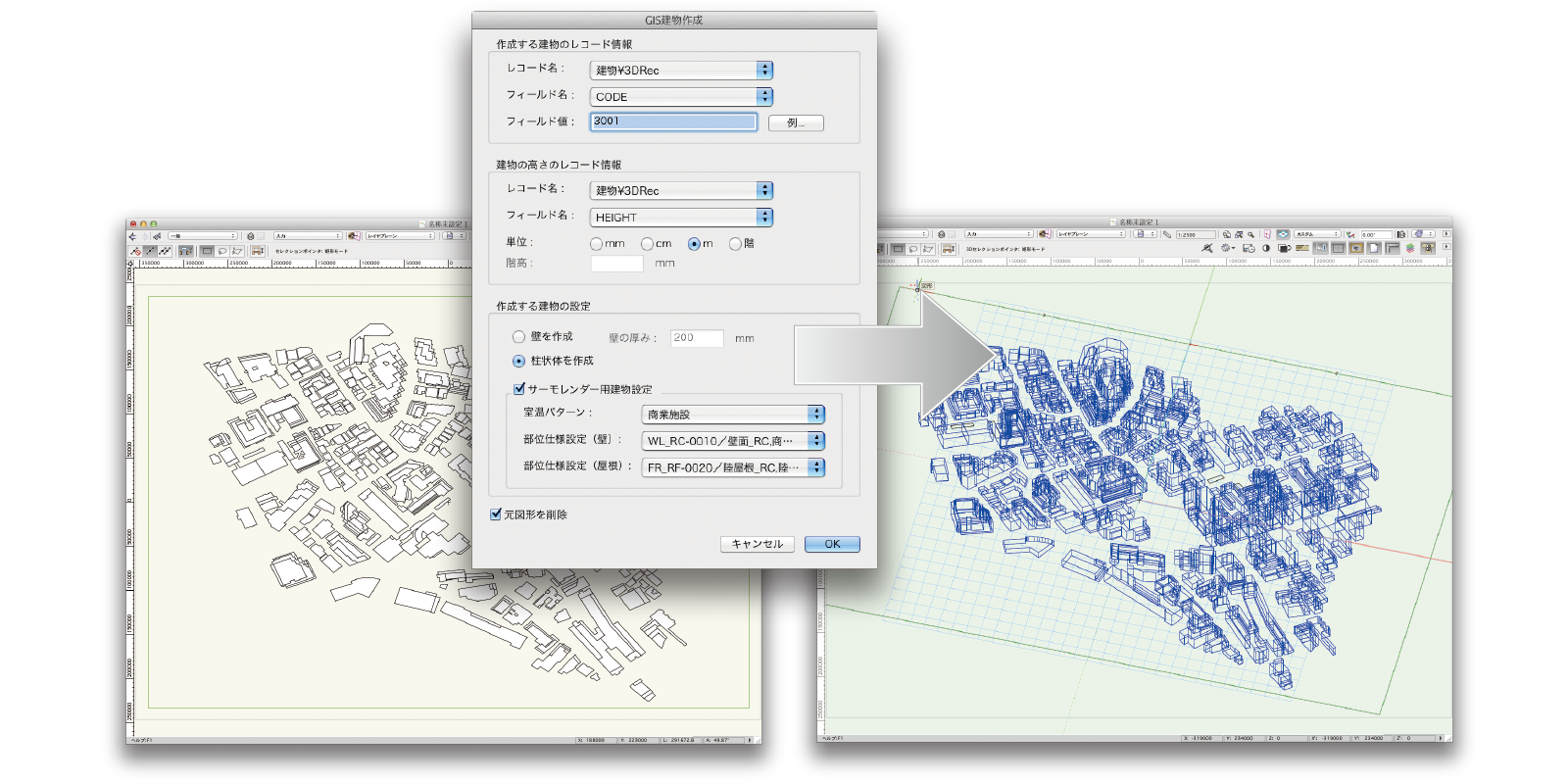 また、GISから取り出したShapeファイルをもとに、3D化と部位仕様の設定が同時に行えます。Shapeファイルでなくとも、高さなどのレコードが付加された2Dオブジェクトでも可能です。