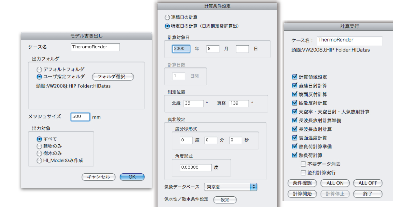 THERMORenderでは、気象条件を細かく設定することが可能です。全国主要5都市(東京、名古屋、仙台、大阪、福岡)4シーズン分の標準的な気象データを搭載し、作業の手間を軽減できます。