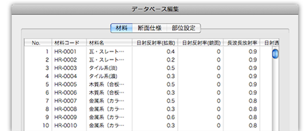 THERMORenderには、あらかじめ熱物性値データがプリセットされた建材が100種類以上登録されています。