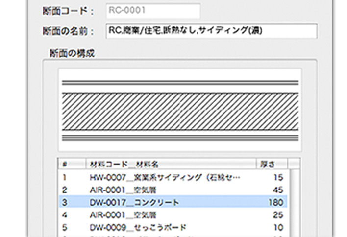 また、これらを組み合わせた「壁」や「屋根」、熱負荷計算に用いる「床」なども登録されているため、3Dモデルに設定するだけで簡単にシミュレーション用モデルを用意することが可能です。もちろん、個々の材料を組み合わせて新たな断面を追加したり、全く新たに材料を作成することも可能です。