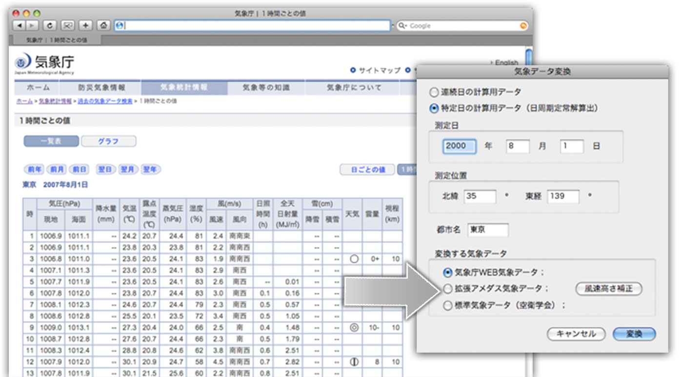 さらに、気象データ変換機能を利用し、「気象庁WEB気象データ」や「拡張アメダス気象データ」、「標準気象データ」を取り込み、シミュレーションに利用できるため、地域性を考慮したシミュレーションが行えます。