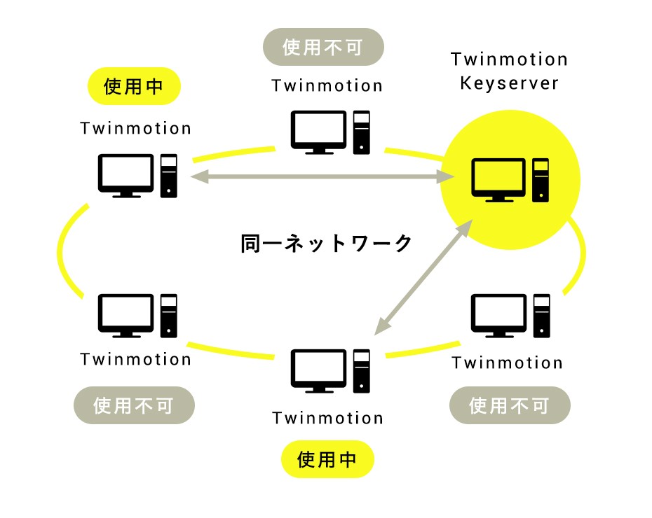 - これらのPCはすべて同一ネットワーク上に置かれている必要があります。どのPCでTwinmotionを使用しているかは、Twinmotion Keyserverの画面から確認することができます。